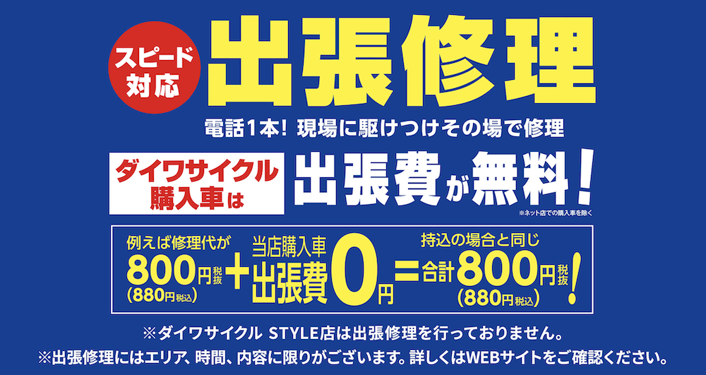 ご購入後の自転車は出張修理サービスで突然のアクシデントにも対応しています。是非ご利用ください。