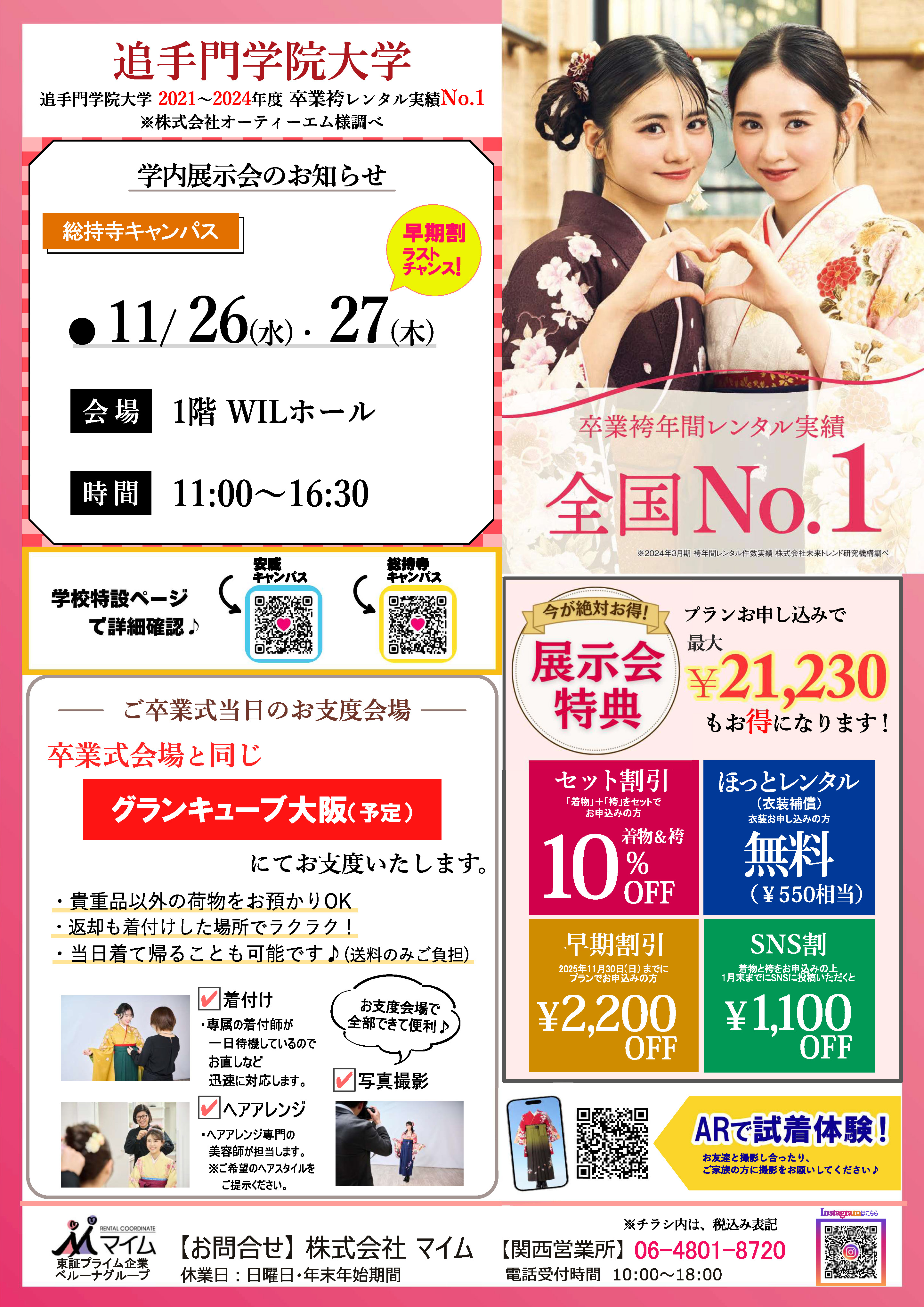 着物・袴以外の着付小物と記念写真がセットになった追手門学院大学生限定のパックです。